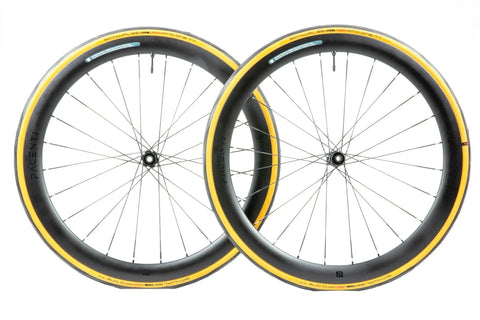 Laced with BERD PolyLight spokes. These are the lightest spokes on the market, manufactured from ultra high molecular weight polyethylene (UHMWPE) that has 12 times the strength-to-weight ratio of steel - and just so happens to float on water.
