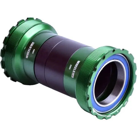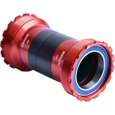 T47 threaded BB cups for T47 frames and 30mm diameter spindle compatible cranks. Cups have internal bearings, and can be used in BB shells with widths from 86mm to 121mm. Machined aluminum cups thread together directly into a T47 BB shell. Bearings are easily serviced or replaced. Includes sleeve to fit between cups for added protection from dirt and grime, and also keeps your internal wires and hoses from rubbing on the crank spindle.